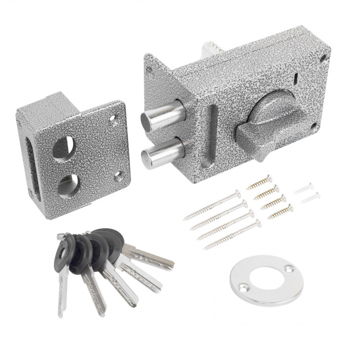Замок накладной цилиндровый с вертушкой. Предназначен для установки на деревянные двери. Комплектация — 5 ключей, запорная планка, накладка. Механизм замка под перфоключ, идет совместно с корпусом. Закрывание и открывание замка изнутри производится вертушкой, снаружи ключом.